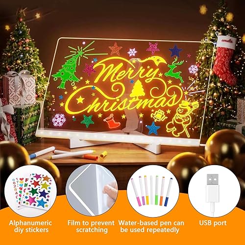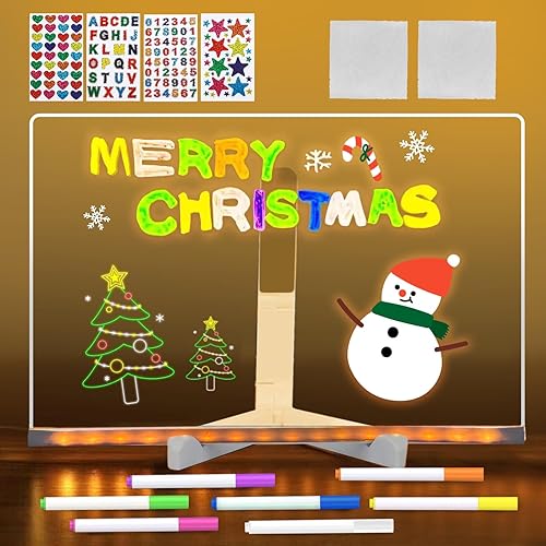 Pizarra LED Transparente para Niños 30x20cm Tablero Acrílico Luminoso con Luz Cálida Tablero de Mensajes Iluminado con 7 Rotuladores de Colores Pegatinas Paños y Soporte Ajustable